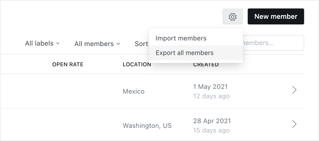 Export all members in one CSV file from the Members dashboard in Ghost Admin.