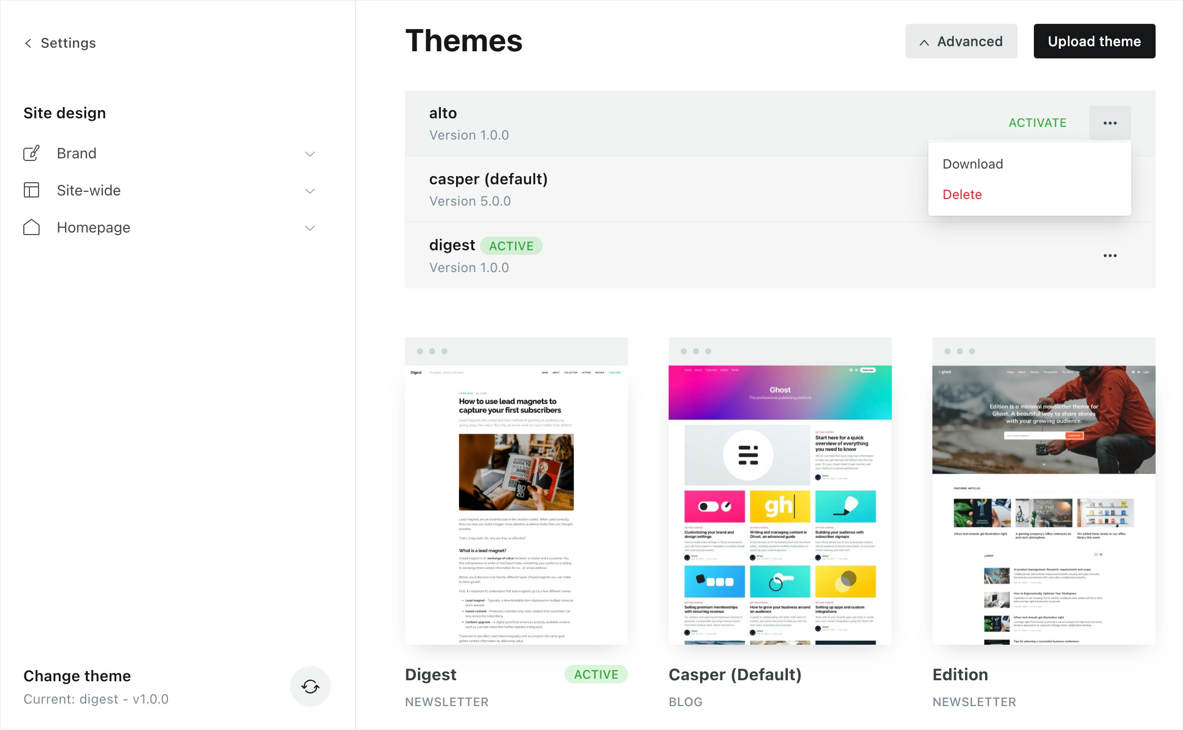 Navigate to theDesignsettings page, and navigate to the themes section to download your active theme, and any other themes you want to store. This will be a.zipfile.